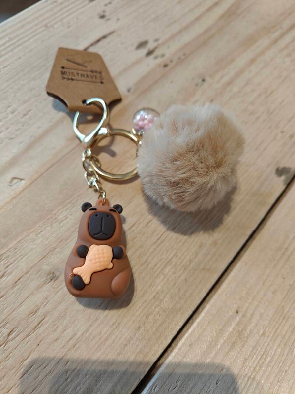 Een super toffe sleutelhanger met een pompon en capybara beertje aan!