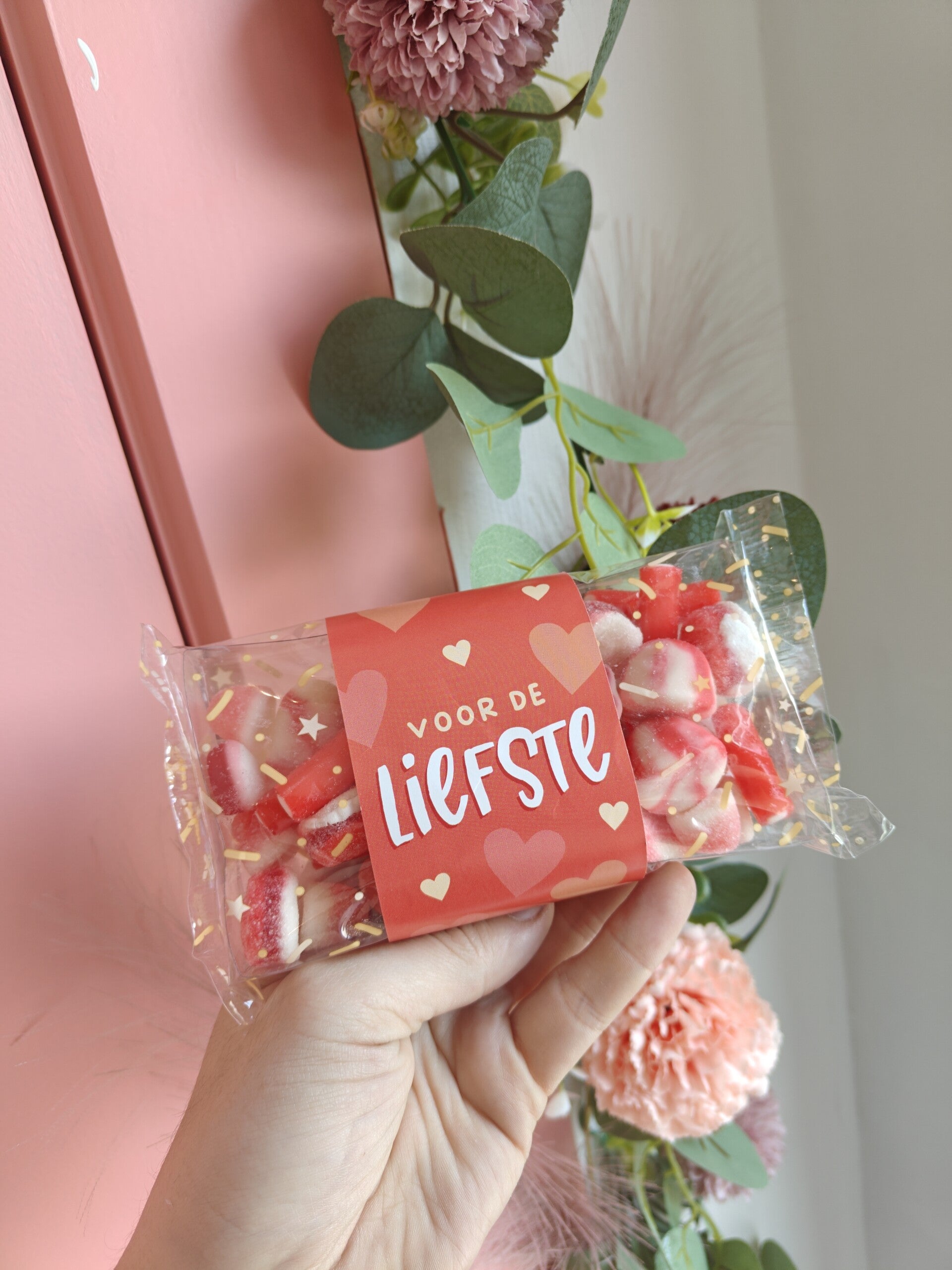 Een snoepreep met onze zachte hartjes mix en een mooie bedrukking met de tekst Voor de liefste en 140 gram snoep.
