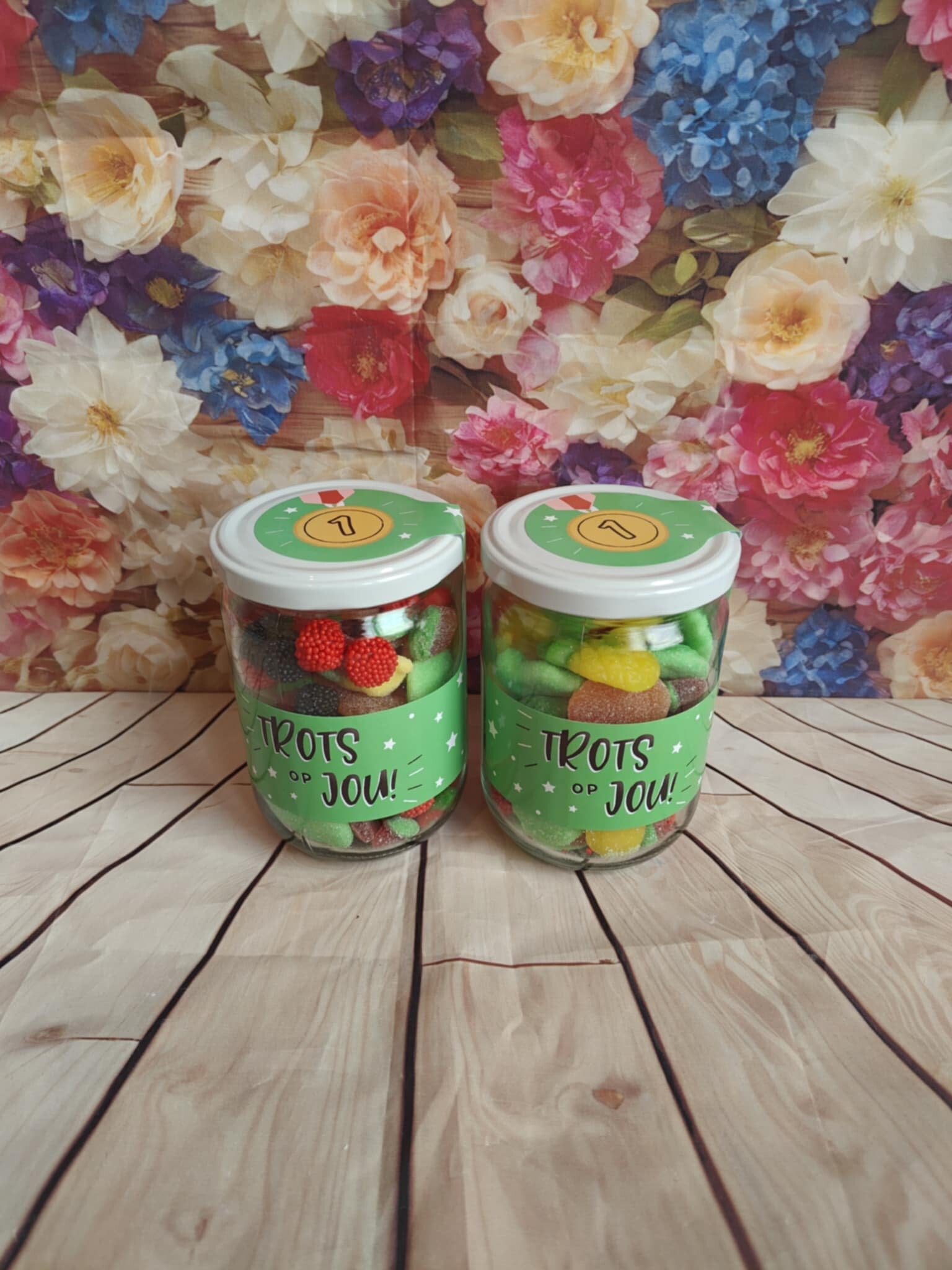 Een vrolijke snoeppot gevuld met een zoete fruitsalade vol tutti frutti snoepjes! Op de pot staat de opdruk "Trots op jou!"