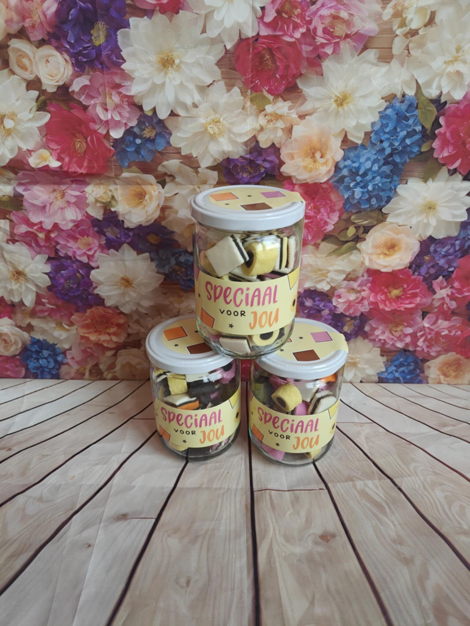 Een kleurrijke snoeppot met onze Engelse drop mix voor de echte dropliefhebbers! De pot heeft de opdruk "Speciaal voor jou!".