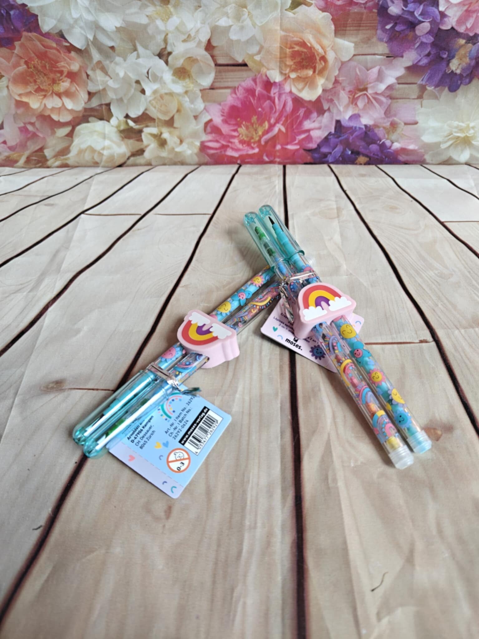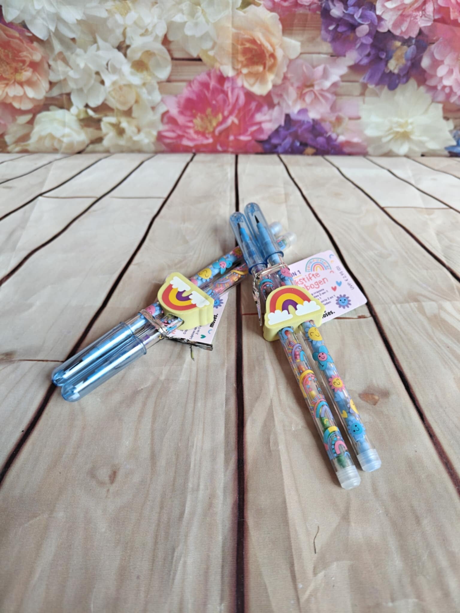 2 in 1 regenboog vulpotlodenset met regenboog gum. 1 potlood is gevuld met gewone potloden, de andere met verschillende kleurtjes. Afmeting: 15 cm.