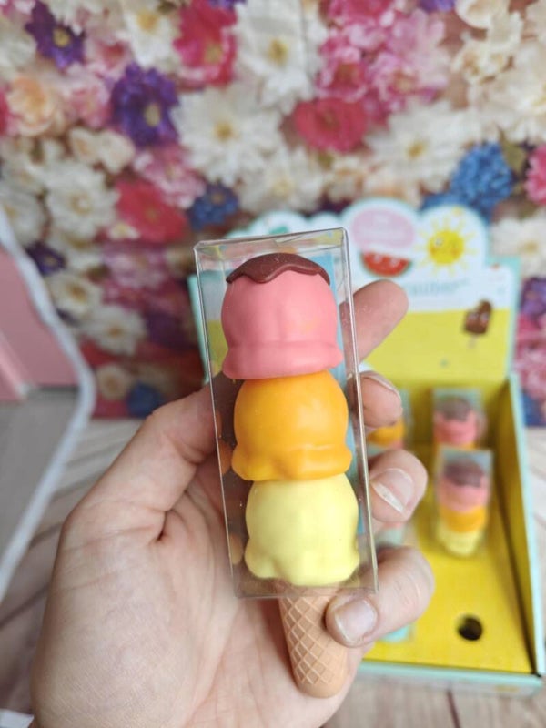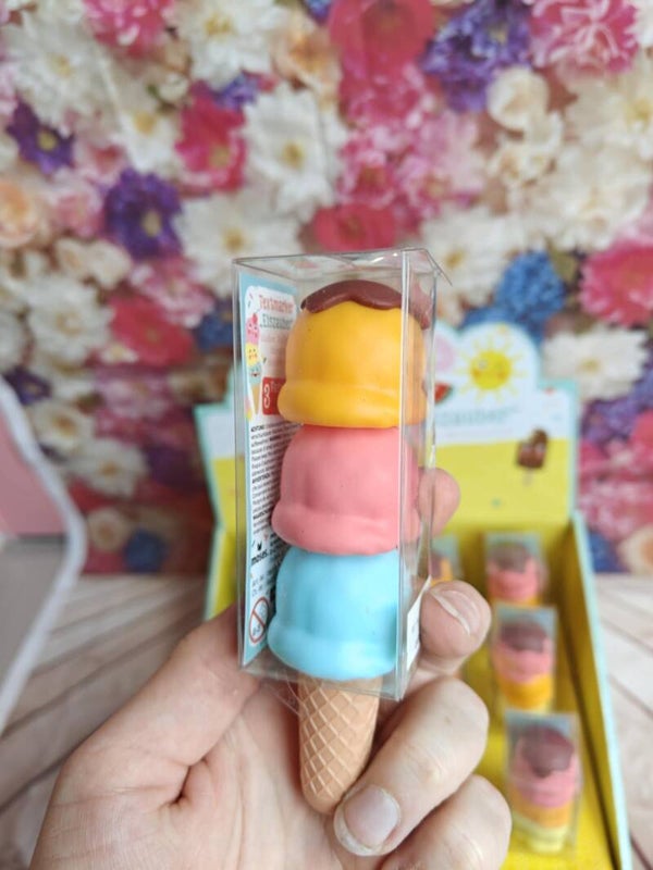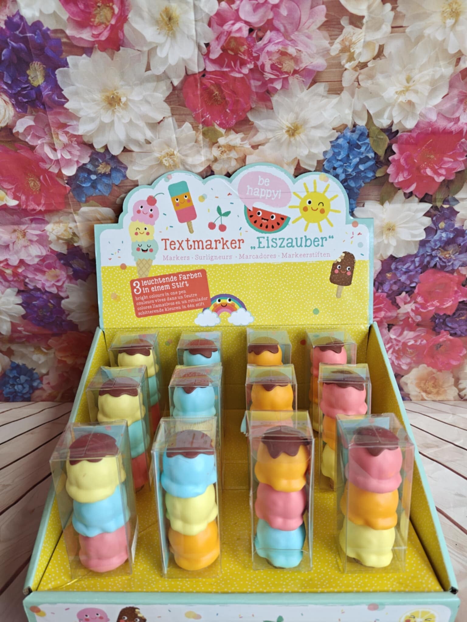 Markeerstiften als bol ijs op een hoorntje! 3 stiften/ijsbollen op een hoorn in transparante geschenkbox. Afmeting box: 3.3 x 12.5 x 3.3 cm. Uit de serie "Be happy". Aanrader!!!!
