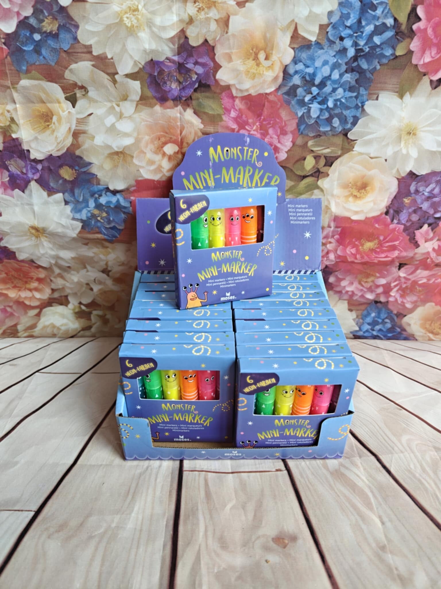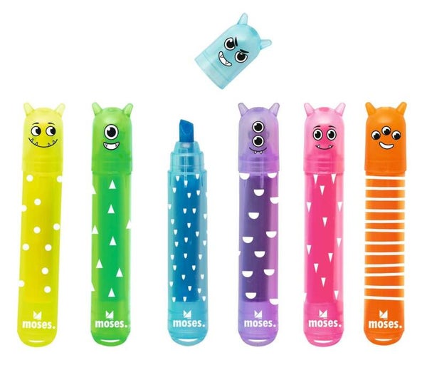 Set van 6 markeerstiften in de bekende neon kleuren, afmeting stift: 6.8 x 1.1 cm. Afmeting set: 7.6 x 6.8 cm.