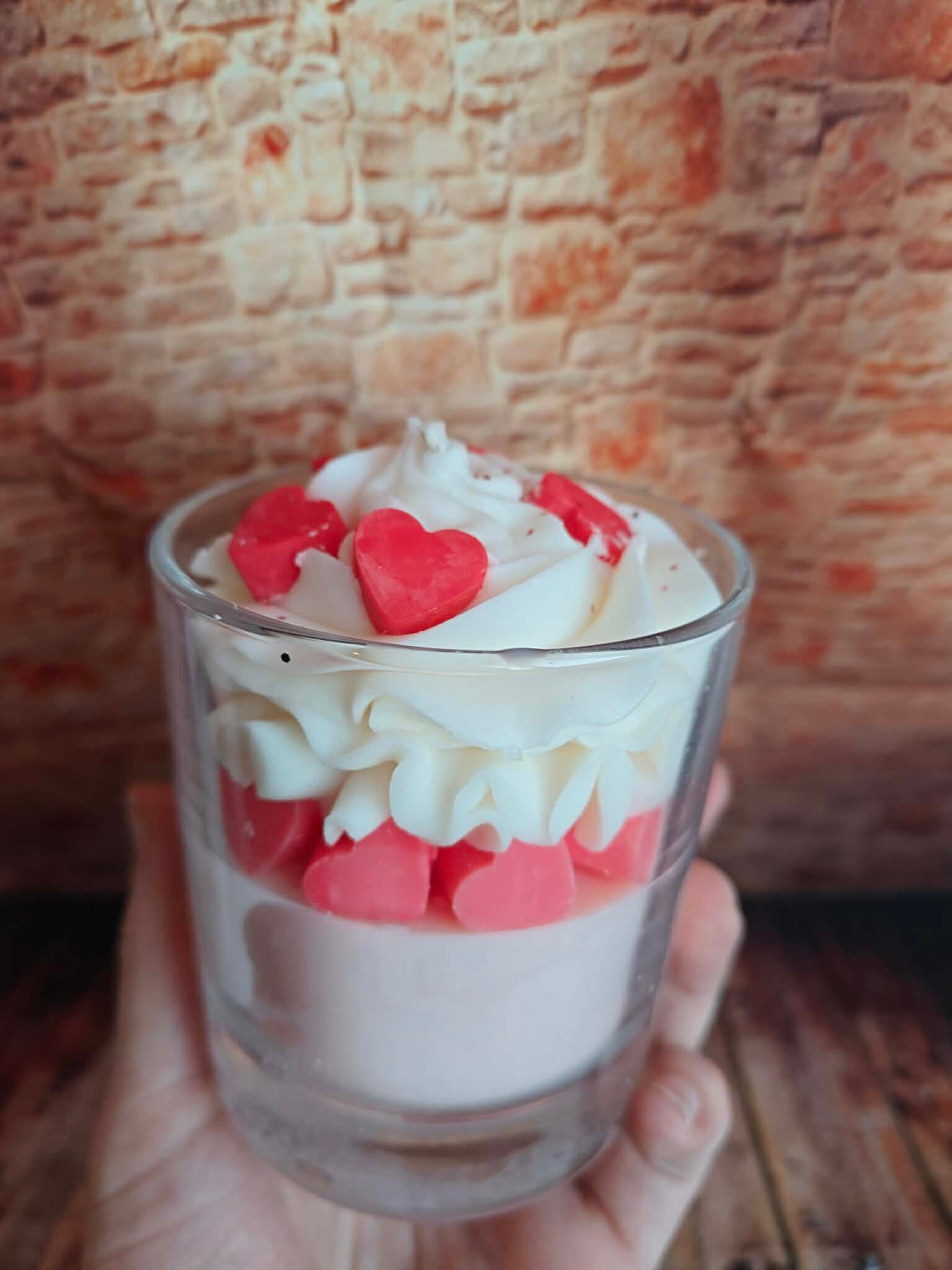 De kaars bestaat uit een roze waslaag, gevolgd door een laagje rode hartjes, en is afgewerkt met een fluffy slagroomtopping en decoratieve hartjes bovenop.